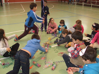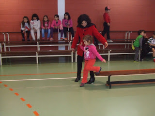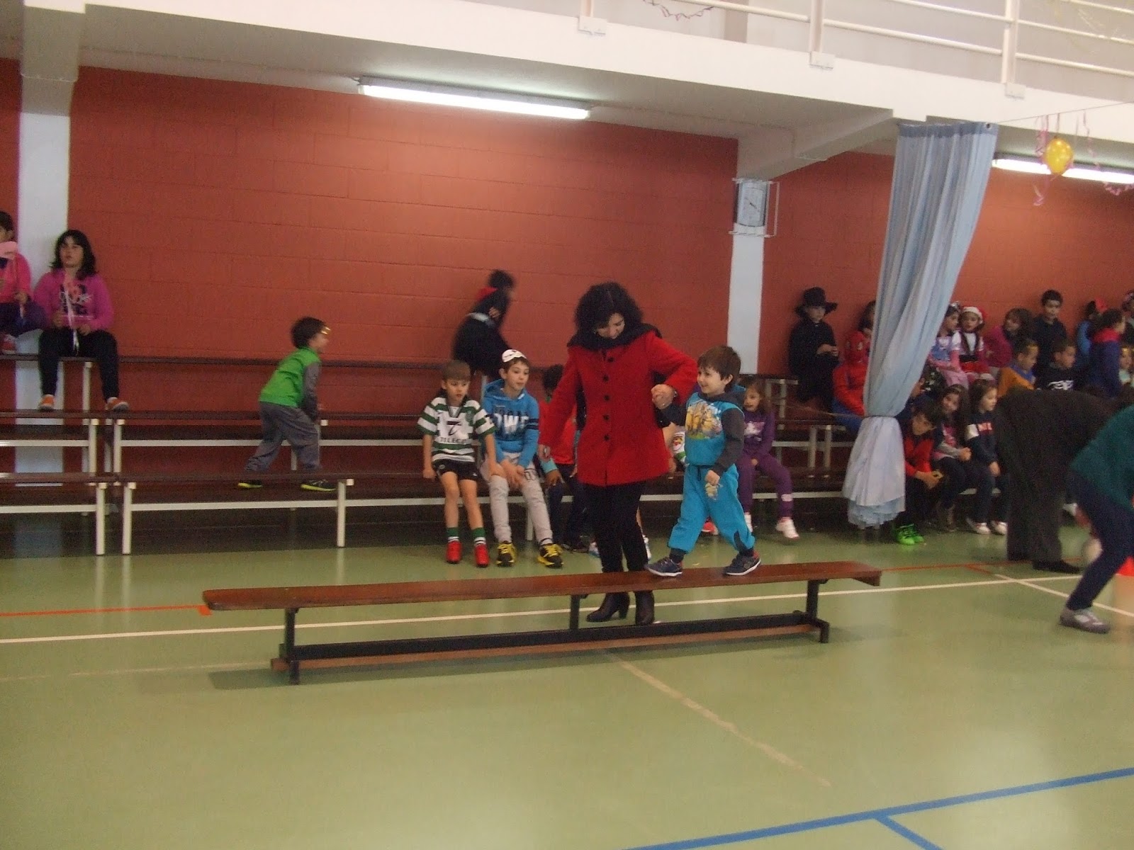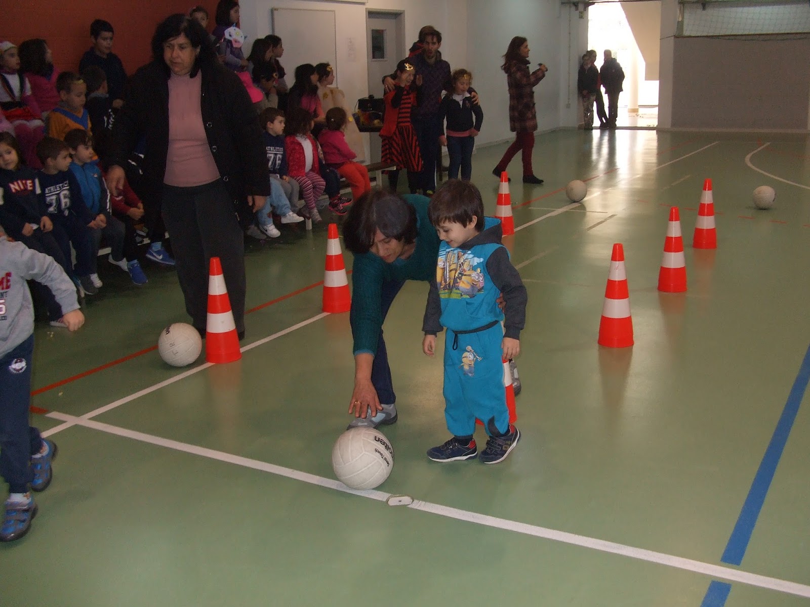 Havia varias estações onde os professores ajudavam os alunos a concretizar algumas habilidades físico motoras: contornavam-se obstáculos com bola, havia cordas para saltar, balões para jogar, corrida de sacos, estafetas com colheres de pau e bolinhas para equilibrar.